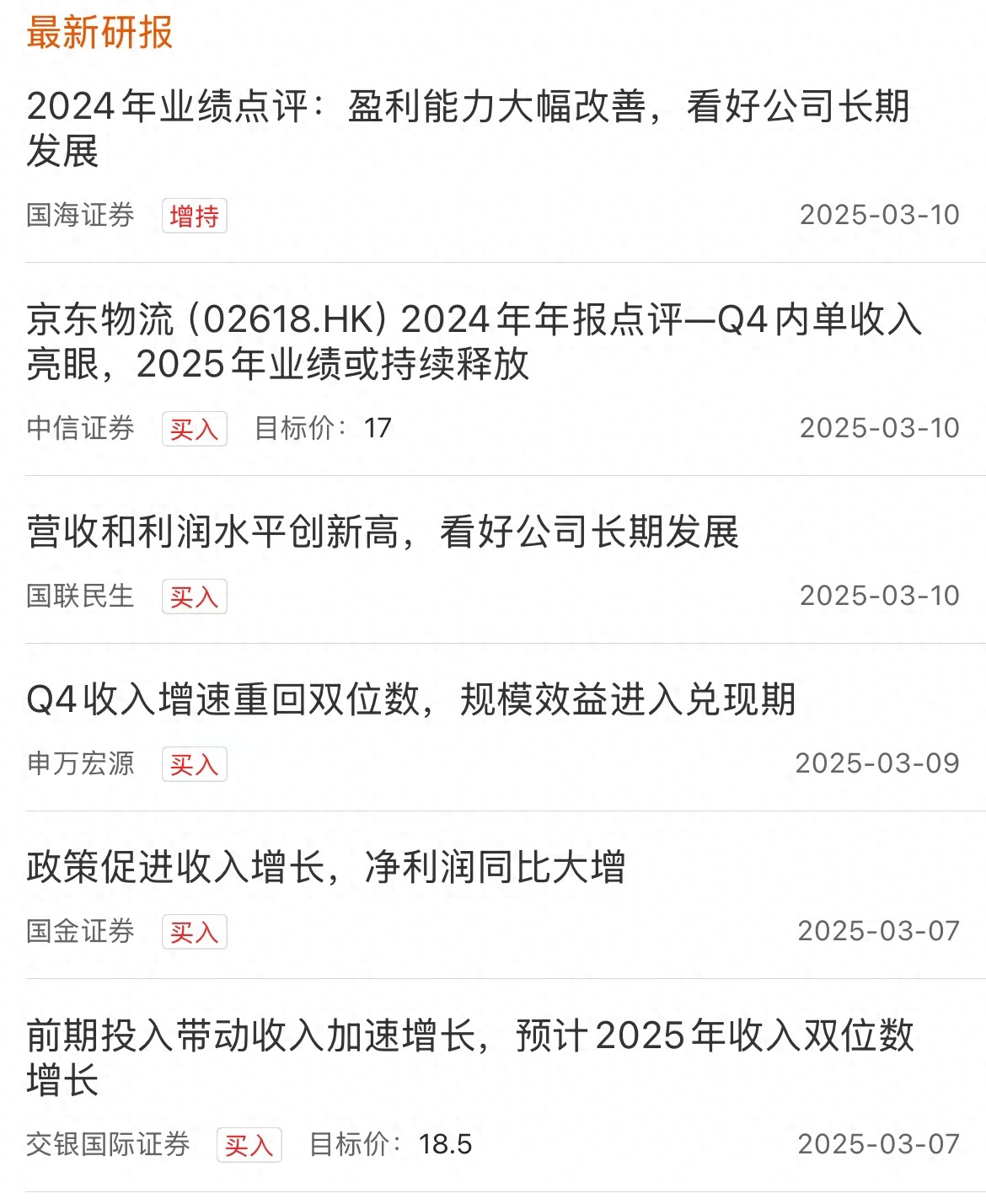 交银国际证券研报表示,预计2025年收入较2024年加速增长,主要反映前期投入对收入的提振作用;且预计利润率进入平稳阶段,公司保持对履约时效和市场拓展投入以拉动长期收入增长,并维持“买入”评级。华泰证券则表示,看好京东物流在一体化供应链的物流服务能力和产品竞争力的提升,将助力进一步获得业务增长,维持“买入”评级。浙商证券表示,京东物流作为一体化供应链的龙头企业,业务量持续提升,规模效益逐渐显现,公司营收有望进一步提升,维持“增持”评级。申万宏源也表示,公司收入保持较高增速,利润稳健增长,维持“买入”评级。