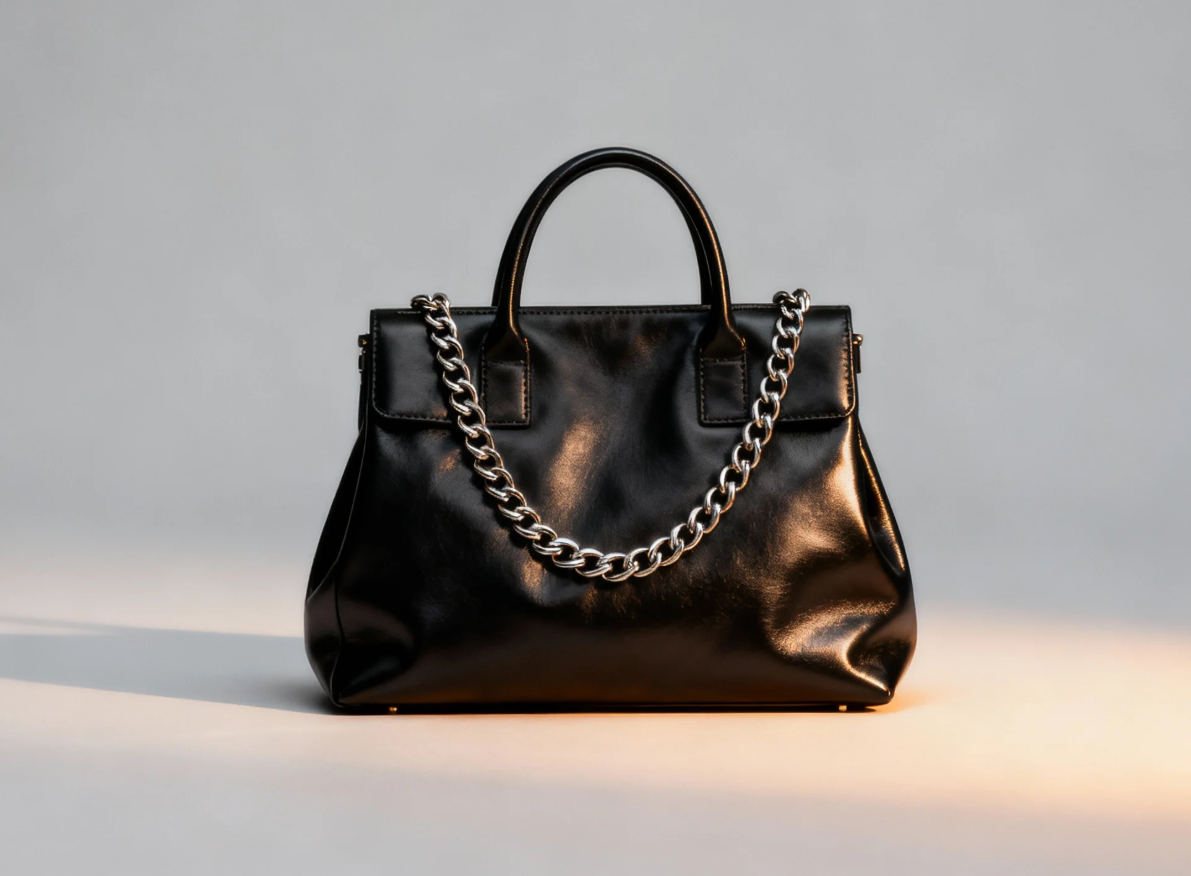 【图1】的女士拿着【图2】的包包,站在【图3】的墙前,随着微风吹起,她回头笑了一下
